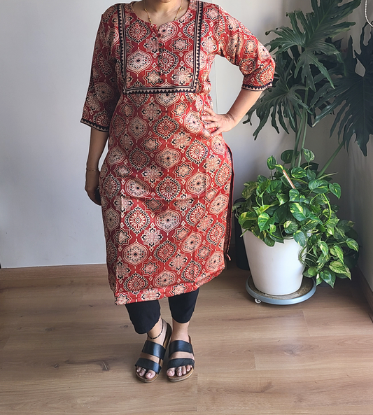 Ajrak Red-Black Mashru Silk, Long Kurta