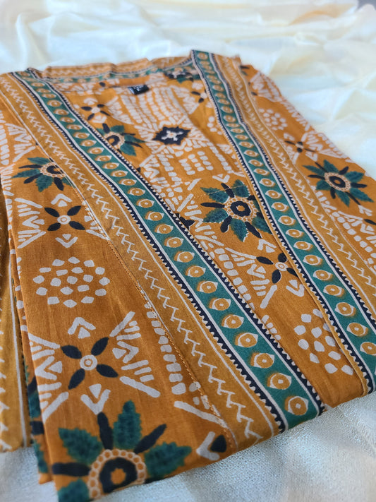 Floral Block Printed Mustard Cotton Kurta and Pant Set